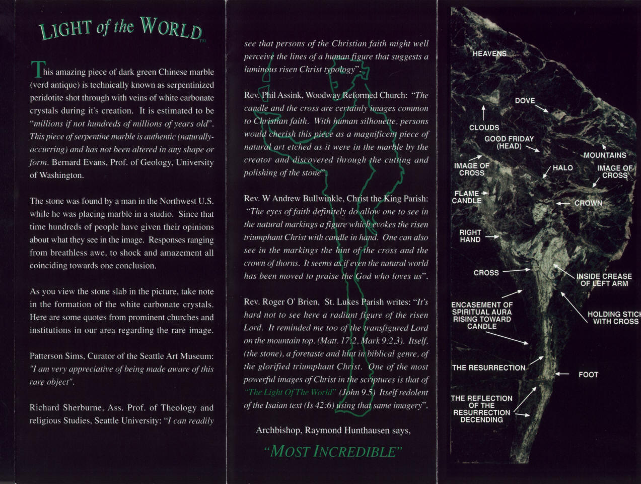 For more information, please contact Robert Lang at (206) 542-1041 or send E-Mail to: lightoftheworldstone@gmail.com
